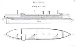 SMS König Wilhelm [a] (King William) was an armored frigate of the Prussian and later the German Imperial Navy. The ship was laid down in 1865 at the Thames Ironworks shipyard in London, originally under the name Fatih for the Ottoman Empire. She was purchased by Prussia in February 1867, launched in April 1868, and commissioned into the Prussian Navy in February 1869. The ship was the fifth ironclad ordered by the Prussian Navy, after Arminius, Prinz Adalbert, Friedrich Carl, and Kronprinz. She was built as an armored frigate, armed with a main battery of sixteen 24 cm (9.4 in) and five 21 cm (8.3 in) guns; several smaller guns and torpedo tubes were added later in her career.