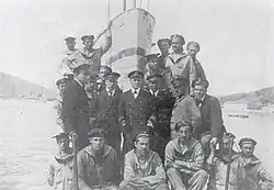 On the night of 12 May, U-6 headed out to try to intercept shipping between Santa Maria di Leuca and Valona.[11] Linienschiffsleutnant Hugo von Falkhausen, U-6's commander since November 1915,[4] attempted to pass underneath two drifters that formed a part of the Otranto Barrage. While submerged, von Falkhausen heard an unexplained noise on the hull of the boat, which was likely the sound of U-6 fouling one of the anti-submarine nets deployed from the drifter Calistoga. The drifter's skipper was alerted to the submarine's presence when one of the indicator buoys had fired. Calistoga launched signal flares that attracted the attention of two nearby drifters Dulcie Doris and Evening Star II. In the meantime, von Falkhausen surfaced U-6 to try to cut loose the buoy being dragged behind his boat. When the hatch was opened, the crew discovered the boat entangled in the net.[12]