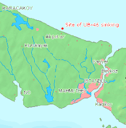 On 7 December 1916, the stern of UB-46 struck a Russian mine 300 metres (980 ft) off the shore of the Turkish village of Akpınar, approximately 30 kilometres (19 mi) north-west of the entrance to the Bosphorus.[19] The vessel's entire complement (reported by Helgason as 20) perished in the sinking.[1][18]