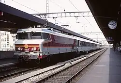 The SNCF Class CC 6500 is a class of 1.5 kV DC electric locomotives. The CC 6500 was, together with the CC 40100 and diesel CC 72000, the first generation of the 'Nez Cassé' family of locomotives and designed for hauling express trains with speeds up to 200 km/h (124 mph) but also used for heavy freight trains. Among the trains they hauled in their first years of service were the SNCF flagship train Le Mistral and Trans Europ Express trains Aquitaine, Le Capitole and l'Étendard.[2]