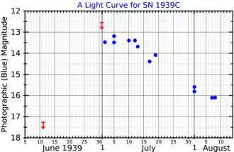 ![]() A light curve for SN 1939C, adapted from Schaefer (1996).[1] The red arrows show upper limits. | |