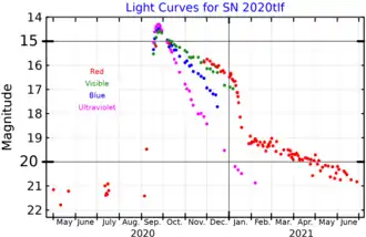 ![]() Light curves for SN 2020tlf in four photometric bands, plotted from data published by Jacobson-Galán et al. (2022)[1] | |