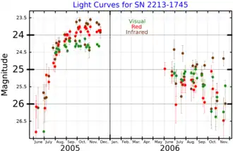 ![]() Light curves for SN 2213-45 in three photometric bands, plotted from data published by Cooke et al. (2012)[1] | |