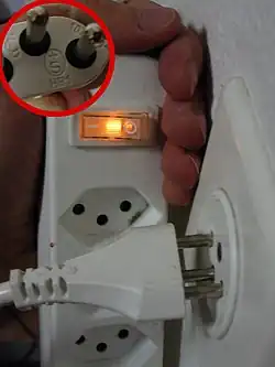 From the Type 12 proposed in 1937[5] and introduced in 1953, the international standard IEC 60906-1 was derived in 1986, on which only the national standards of Brazil (NBR 14136 or Type N) and South Africa (SANS 164-2) are based. Despite the great similarity, these are not compatible with SN 441011, as the polarity has been reversed in IEC 60906-1 and the earthing contact is only 3 mm offset from the center line instead of 5 mm. (A combined socket, which accepts both plugs according to SN 441011 and IEC 60906-1, would, however, be easy to implement, since a further hole for the earthing contact with the smaller distance would only have to be added opposite the previous central hole.) The hexagonal shape of the Euro plug (2.5 A) is also derived from the Swiss standard. This differs only slightly from the connector Type 11 (10 A).