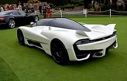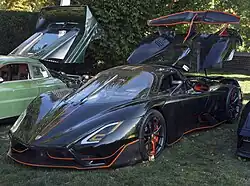 The SSC Tuatara /ˈtuətɑːrə/ is a sports car designed, developed and manufactured by American automobile manufacturer SSC North America (formerly Shelby SuperCars Inc.). The car is the successor to the Ultimate Aero and is the result of a design collaboration between Jason Castriota and SSC. Initially powered by a 6.9-liter twin-turbocharged V8 engine, the capacity of the engine was later reduced to 5.9 L (360.8 cu in) in order to allow the engine to have a higher redline of 8,800 rpm.[1] SSC had stated that the power output would be rated at 1,350 hp (1,000 kW) or 1,750 hp (1,300 kW) on E85 fuel, along with a 300 mph (483 km/h)+ top speed.