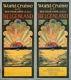 In 1922 the ship was at last fitted out as a passenger liner. In 1923 she was transferred back to Red Star Line and her name was changed back to Belgenland. From 1924 onward she made her name making annual cruises around the World, leaving New York in November or December and returning in April the next year. She pioneered cruise ship visits to destinations including Bangkok and Bali, and steamed almost 250,000 miles without defect.