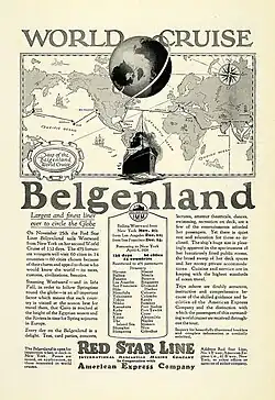 In 1924–25 Belgenland made her first cruise around the World. Her route was 28,310 miles, and would take 133 days to visit 60 cities in 14 countries. Fares were $2,000 for a single berth and $4,000 for a double suite. The best de luxe suites were $25,000 for four people and $40,000 for six. Gross fare income for this first cruise was about $2 million.[32]