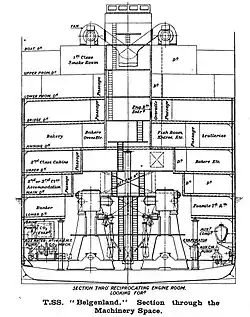 Belgic was one of a series of H&W steamships that were propelled by a combination of reciprocating steam engines and a steam turbine. She had three screws. A pair of four-cylinder triple expansion engines drove her port and starboard screws. Exhaust steam from those engines powered one low-pressure turbine that drove her middle screw.[7] H&W had used this arrangement first on Laurentic for White Star Line, and most notably on the three Olympic-class ocean liners. Between them, Belgic's three engines were rated at a total of 2,653 NHP[9] or 18,500 ihp[5] and gave her a speed of 17+1⁄2 knots (32.4 km/h).[4][10]