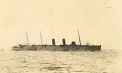H&W planned Belgenland to have three funnels and two masts, and a passenger superstructure of several decks. For war service, however, she was completed as a cargo ship with two funnels and three masts, and without the two upper decks of her planned superstructure.[3][4][6] The extra mast enabled her to have more derricks, with which to handle cargo more quickly.[3] She was one of a number of ships that had been planned as liners but were part-completed at that time as cargo ships. H&W completed the similar but smaller Calgaric with one funnel and almost no superstructure, to serve as the wartime cargo ship Orca.