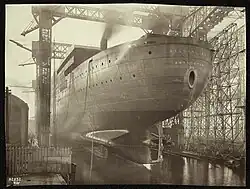 IMM ordered Belgenland in March 1912[3] from Harland & Wolff, who built her on slipway number 1 as yard number 391. She was laid down before the First World War, but by the time she was launched on 31 December 1914 the war had been under way for four months. Work on her was suspended to let H&W concentrate on more urgent war-related work. As the Central Powers' U-boat campaign depleted Allied shipping, the need for replacement ships increased, and H&W resumed work on Belgenland. She was completed as a troop ship on 21 June 1917 and renamed Belgic.[4][5]
