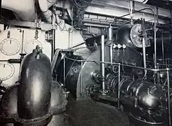In addition to the usual feed and bilge pumping engines, the machinery department was fitted with oil lubricating pumps which serviced the turbine bearings, sanitary pumps, water heater, ash hoist and fresh water pumps.[4]