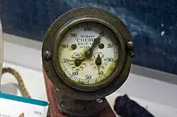 A taffrail log is a mechanical device used to determine a ship's speed. The device obtains its name because the dial was typically attached to a plank that was secured to the taffrail of a ship. A rotor was towed behind the ship to measure the distance travelled in a similar way to an odometer.