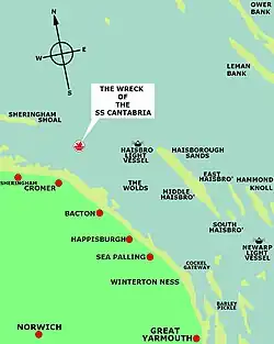 Cantabria's wreck is off the coast of Norfolk, 12 miles ENE[2] of Cromer.[3] She was shelled by the Spanish Nationalist auxiliary cruiser Nadir.
