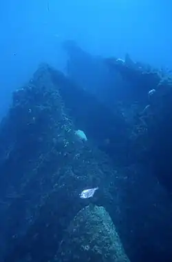 The bow stands vertical, and the bow section has collapsed into two parts. A windlass and a mound of chain remain in the bow area. The remains of the propeller remain on site, and its shaft is visible in the collapsed hull. The rudder is detached from the stern, but remains on site. The highest part of the wreck is the port bilge keel and double-bottomed hull. It stands 20 feet (6 m) above the seabed, held up by the starboard boiler.[28]