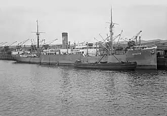 On 31 July 1940, Empire Energy left Liverpool with Convoy OB 192, which dispersed at sea on 4 August.[17] She called at Durban, South Africa from 8 to 16 September, and reached Bombay (now Mumbai), India, on 6 October. She left Bombay on 3 November; called at Durban from 27 November to 13 December; and Cape Town from 18 to 20 December. She was in Luanda, Angola from 1 to 12 January 1941; briefly called at Pointe-Noire, Belgian Congo; and on 23 January arrived off Freetown, Sierra Leone[18] with a cargo of oilseed to await a convoy home.[19]