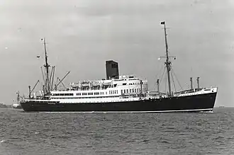 Gneisenau's maiden voyage began on 3 January 1936.[2] Until the outbreak of World War II, she worked NDL's express service between Bremen and the Far East. At 21 knots (39 km/h; 24 mph)[3] she was among the fastest ships on the route.[4] On 2 May 1943, Gneisenau was mined in the Baltic Sea, capsized, and sank. The wreck was raised on 12 July 1950 and scrapped in Denmark.[5]
