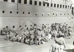 From Colombo Katoomba sailed to India, called at Karachi[21] and then embarked 640 troops in Bombay.[22] They were members of the Second Australian Imperial Force (Second AIF) who had served in the Middle East and were being redeployed to the south west Pacific. Katoomba left Bombay on 4 April, called at Colombo and Mauritius, reached Fremantle on 7 May and then continued via Adelaide to Sydney.[21]