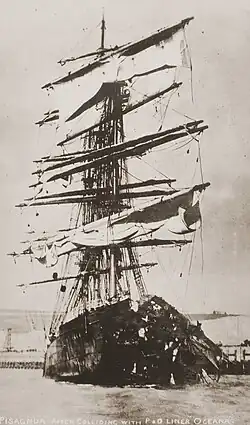 Pisagua drifted off leeward after the collision, but managed to survive with severe damage to the bow and foremast.[2][10] Towed to Dover for immediate sea-going repairs, she was then towed to Hamburg where she was condemned.[9] She was rebuilt as a whale factory ship and operated by Søren L. Christensen,. On 12 February 1913, Pisagua was stranded at Low Island, South Shetland Islands.[9] Although insured for NOK 318,000, she was subsequently condemned and written off at a loss to her owners.[9]