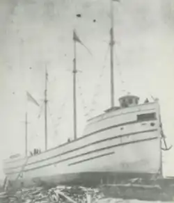Ohio (Official number 19438) was an early wooden bulk carrier.[5] She was built in 1875 by Ohio resident John F. Squires of Huron, Ohio.[6] She was launched in April of 1875.[1] Her hull was 202.2 feet (61.6 m) long, her beam was 35 feet (11 m) wide and her cargo hold was 18.50 feet (5.64 m) deep. She had a gross tonnage of 1101.81 tons and a net tonnage of 850.82 tons. She was powered by a low pressure condensing engine which was fueled by a single coal-burning Scotch marine boiler. She was used to haul bulk cargoes across the lakes such as iron ore, coal and grain.[1]