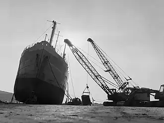 On 24 November 1965,[6] Santa Kyriaki was in ballast off the coast of the Netherlands when she was caught in a Force 10-11 storm. The Dutch tug Titan offered assistance to Santa Kyriaki, which was refused. At 15:00 CET (14:00 GMT), Santa Kyriaki came ashore south of IJmuiden. Her 17 crew were taken off by a Koninklijke Marine helicopter.[5] After the storm had subsided, Santa Kyriaki became a temporary tourist attraction.[7] On 30 December, the contract for the salvage of the ship was awarded to NV Bureau Wijsmuller under Lloyds Open Form conditions. Over 70,000 cubic yards (54,000 m3) of sand was excavated to form a basin which enabled Santa Kyriaki to be turned through 60°. She was refloated on 8 March 1966 with assistance from the tugs Titan and Simson, aided by the use of her own engine. Titan towed her into IJmuiden,[8] where she was declared to be a constructive total loss.[1] She was later towed to Amsterdam.[8] Santa Kyriaki arrived under tow on 17 July 1966 at Avilés, Spain for scrapping.[1]