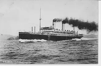 SS Shinyō Maru (春洋丸) was built in Nagasaki in 1911 by Mitsubishi Dockyard & Engine Works.[2] Her length was 558 ft (170 m) and breadth 61.9 ft (18.9 m) Her tonnage was 13,426 GRT, with a displacement of 21,650 ('22 000') tons.[1] Her triple screws gave her a speed of 21 knots. The liner had accommodation for 275 first class, 75 second class, and 800 steerage passengers. Shinyo Maru was powered by thirteen Scotch boilers providing steam for three sets of Parsons turbines for 17,000 horsepower.[3]