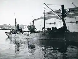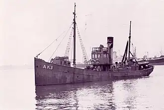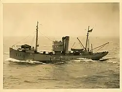At the outbreak of World War II, Thomas Currell was on a usual fishing trip, and was unaware of the declaration of war due to a lack of radios on board, and was unable to be contacted.[2][3] She would return to Auckland, one week after war was declared, she discharged her catch and would be shifted to the Devonport Naval Base, as it had been commandeered by the government.[3] Along with the other Sanford trawlers, James Cosgrove and the Humphrey, they were converted for minesweeping duties and fitted with 4-inch (102 mm) guns, depth charges, and minesweeping equipment, also being given a wireless telephone and telegraph equipment.[3] The Thomas Currell was commissioned for the Royal New Zealand Navy on 10 October 1939, serving at Auckland.[3][4][5] On the morning of 19 June 1940, a distress signal was received from the passenger ship RMS Niagara, reporting it had struck a naval mine between Bream Head, and the Moko Hinau Islands and was sinking.[4] The James Cosgrove and Thomas Currell were ordered to sea, steaming at full speed towards her, arriving at 12:50 PM with minesweeping gear being deployed at 2:48 PM.[4] She and the James Cosgrove would discover two contact mines which had been laid recently, both were destroyed by rifle fire.[4] Thomas Currell would be paid off in September 1944, with work to convert her back into a fishing trawler completed by late 1945.[4][5]