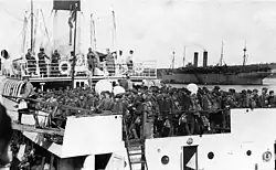 The declaration of the First World War halted transatlantic crossings. The Traffic and the Nomadic were requisitioned on 25 April 1917 by the French Navy and taken to Saint-Nazaire until 1919, to serve as auxiliary minesweepers.[7] They carried out some ferrying missions of American troops in Brest in 1919, before their return to Cherbourg.[16] The Traffic then resumed her functions for White Star Line, without incident until 1927. On this date, Lord Kylsant, the new owner of the company, decided to separate from the two tenders.[15]