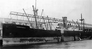 When Washingtonian began sailing for American-Hawaiian, the company shipped cargo from East Coast ports via the Tehuantepec Route to West Coast ports and Hawaii, and vice versa. Shipments on the Tehuantepec Route arrived at Mexican ports—Salina Cruz, Oaxaca, for eastbound cargo, and Coatzacoalcos, Veracruz, for westbound cargo—and traversed the Isthmus of Tehuantepec on the Tehuantepec National Railway.[10] Eastbound shipments were primarily sugar and pineapple from Hawaii, while westbound cargoes were more general in nature.[11] Washingtonian sailed in this service, but it is not known whether she sailed on the east or west side of North America.[12] After the United States occupation of Veracruz on 21 April 1914 (which took place while six American-Hawaiian line ships were being held in various Mexican ports), the Huerta-led Mexican government closed the Tehuantepec National Railway to American shipping. This loss of access (the Panama Canal was not yet open until later that year) caused American-Hawaiian to return to its historic route of sailing around South America via the Strait of Magellan in late April.[13] During the US occupation, the Washingtonian was chartered by the US Navy Department to serve as a non-commissioned refrigerator and supply ship for the US naval fleet off Mexico. She was outfitted for her first voyage at the New York Navy Yard and sailed with 500,000 pounds (230,000 kg) of fresh meat for the United States Navy and the US Army.[14][15] Washingtonian sailed in a rotation with the commissioned Navy stores ships USS Culgoa and USS Celtic.[15]
