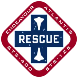 As described by Paul F. Dye, Lead Flight Director of the mission, the emblem "adopts many of the elements seen in a rescue organization's patch - the square cross, bold letterers and border, and simple design. The idea is that the emblem instantly identifies the rescue organization in a crowd of others. In this case, the Shuttle outlines identify the purpose of our organization."[13] In addition, the emblem contains 11 stars, symbolizing the combined 11 crew-members who would return to earth onboard STS-400.