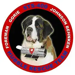 The first flight crew assigned to the mission created another, more humorous design depicting a St. Bernard with its traditional barrel of brandy replaced by the Hubble Space Telescope. The final flight crew though were unsatisfied with this as a crew patch, and contacted longtime NASA artist Tim Gagnon about creating a new one, but never formally approved a design before the mission was scrubbed.[14]