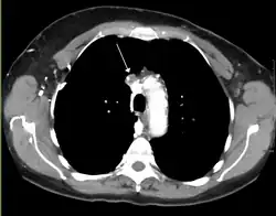 The main techniques of diagnosing SVCS are with chest X-rays (CXR), CT scans, transbronchial needle aspiration at bronchoscopy and mediastinoscopy.[6] CXRs often provide the ability to show mediastinal widening and may show the presenting primary cause of SVCS.[6] However, 16% of people with SVC syndrome have a normal chest X-ray. CT scans should be contrast enhanced and be taken on the neck, chest, lower abdomen, and pelvis.[6] They may also show the underlying cause and the extent to which the disease has progressed.[6]