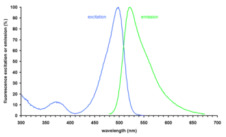 SYBR Green I (SG) is an asymmetrical cyanine dye[1] used as a nucleic acid stain in molecular biology. The SYBR family of dyes is produced by Molecular Probes Inc., now owned by Thermo Fisher Scientific. SYBR Green I binds to DNA. The resulting DNA-dye-complex best absorbs 497 nanometer blue light (λmax = 497 nm) and emits green light (λmax = 520 nm). The stain preferentially binds to double-stranded DNA, but will stain single-stranded (ss) DNA with lower performance. SYBR Green can also stain RNA with a lower performance than ssDNA.