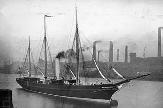 SY Hiawatha was built as the steam yacht Nora by Charles Mitchell & Co, Low Walker, Newcastle Upon Tyne. She was launched on 21 December 1879 (Yard Number 392),[4] but was renamed as the SY Hiawatha in 1888 when she was taken into the ownership of Donald Horne Macfarlane and re-registered in Southampton. Her dimensions were 339grt, 219nrt, 176.8 x 26.1 x 13.4 ft and she was powered by a single screw propeller and a steam engine constructed by R & W Hawthorn, Newcastle. Over her long lifetime she had many changes of ownership and name changes (and was variously known as the Clara, Polygon, La Valette, Akbas and Yeni Gundogdu), but between 1913 and 1915 she had reverted to the name Hiawatha and was owned by Noel Pemberton Billing and registered in London.[4] In 1916 she was converted to a salvage vessel and between November 1917 to 1919 she was employed on Admiralty service as the La Valette. She was eventually (in 1966) converted into a cargo vessel and ended her life as B. Kartal in Turkey, where she was finally broken up in 1982.[4]