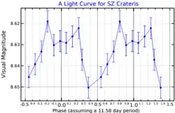 SZ Crateris was discovered to be variable in 1985 and is classified as a marginal BY Draconis variable, with an optical variability cycle of 11.58 days.[15] The star causing the variability is unspecified[16] and the total brightness change is less than 0.1 magnitudes,[7] but the faintness of the secondary makes it likely that the primary star is the one varying in brightness.[15] Compared to the Sun, SZ Crateris has a slightly higher proportion of elements other than hydrogen and helium.[10] Based upon gyrochronology, the estimated age of this star is under 200 million years.[12]
