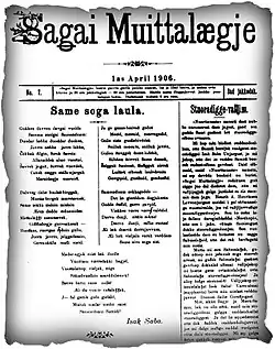Saǥai Muittalægje is famous for being where Isak Saba's "Sámi Soga Lávlla" (The Song of the Sami People), the Sámi anthem, was first published, on the front page of the 1 April 1906 issue, as a poem.[7] Saba and Larsen were friends and Saǥai Muittalægje supported Saba in his successful 1906 race to become the first Sámi elected to the Storting. Saba was a member of the Norwegian Labour Party and he was supported by a coalition of socialists and Sámi activists who helped re-elect him in 1909.[4][5][8] The folding of Saǥai Muittalægje in 1911 contributed to Saba's failed re-election attempt in 1912.