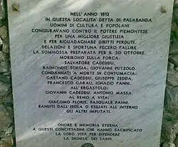 - ^ "La Sardegna usciva malconcia dalla sua rivoluzione. Decapitata e dispersa la classe dirigente che aveva guidato il tentativo di cambiamento, sul campo rimanevano le strutture istituzionali del Regno e una classe dominante votata alla fedeltà interessata al regime sabaudo." Onnis, Omar (2015). La Sardegna e i sardi nel tempo, Arkadia, Cagliari, p.162