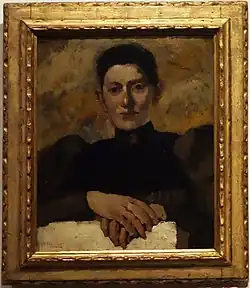 Two of de Swart's works, Indian Buffalo and Balinese Dancer, are documented under the Mahler Foundation's archive.[7] Another sculpture of hers, Boy With A Turtle, is housed in the Singer Museum in Laren.[1] Throughout her life she contributed both financial support and artwork to a number of exhibitions, including The Woman 1813-1913.[2] She also sold works at an Amsterdam craft shop.[2] Against Rodin's training, de Swart went on to make mostly small bronze sculptures.[6] However, she was unfortunately not known for her work as much as she was known for her muse status.[6] She was coined with the term "the Muse of the Tachtigers."[6] This is due to the fact that the writer, Willem Kloos, whom she met in Amsterdam, and the painter Eduard Karsen both fell in love with her in spite of her open homosexuality.[6][8]
