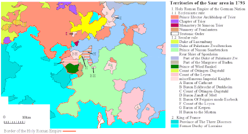 It was not the king of France but the armies of the French Revolution who terminated the independence of the states in the region of the Saarland. After 1792 they conquered the region and made it part of the French Republic. While a strip in the west belonged to the Moselle department, the centre in 1798 became part of the Sarre department, and the east became part of the Mont-Tonnerre department. After the defeat of Napoleon in 1815, the region was divided again. Most of it became part of the Prussian Rhine Province. Another part in the east, corresponding to the present Saarpfalz district, was allocated to the Kingdom of Bavaria. A small part in the northeast was ruled by the Duke of Oldenburg.