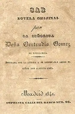 Sab is a novel written by Gertrudis Gomez de Avellaneda and published in Madrid in 1841.[1] The novel centers around the character of Sab, a mulato slave who is in love with his white master's daughter Carlota. The pain of Sab's unrequited love for Carlota leads Sab to his own death, which occurs during Carlota's wedding to Enrique Otway. The novel was not published in Cuba until 1914.