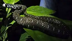 Adults are about 54 cm (21 inches) in total length, of which about 18 cm (7 inches) is tail.[3] Body slender; midbody scales 19, keeled; ventrals 149–157; subcaudals 92–101; dorsum olive-grey, with darker markings; a distinctive white to yellowish-cream spot on snout.