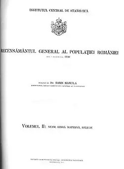 In 1929, he entered Gusti's Romanian Social Institute, and that year, together with five other doctors, he participated in a Gusti-coordinated monograph-writing campaign at Drăguș village in the vicinity of Făgăraș.[5][28] As such, he led operations for the nationwide census of 1930, sponsored by the Rockefeller Foundation,[29] subsequently leading the Institute of Demography and Census. At the Social Institute, with Gusti's consent, he established a section for eugenics and biological anthropology.[30] Supervised by Gusti and funded by the Rockefeller Foundation, Manuilă and his wife also created a Bucharest School of Social Work, which doubled as an institute for the propagation of eugenic ideals.[31] It was located on YMCA grounds, and had Henri H. Stahl, Francisc Rainer, Gheorghe Banu, Mircea Vulcănescu, and Xenia Costa-Foru among its lecturers.[32]
