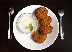 Sabudana vada, also called 'sabu vada', is a traditional deep-fried fritter from Maharashtra, India. It is made from tapioca pearls (sabudana), mashed potatoes, peanuts and spices.[1] It is often served with a spicy green chutney along with hot chai and is best eaten fresh.[2] In other parts of the country, Sabudana vada is the best option to have when fasting. It's usually eaten during religious festivals and during fast/vrat/upvaas, especially in Navratri vrats. Like all vadas, these are best eaten fresh. Sabudana vadas are crunchy and "melt in the mouth."[3]