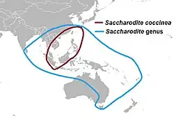 In the genus Saccharodite, the largest number of species have been reported from the island of Borneo (43 species).[3] The genus is also well represented in New Guinea (25 species), the Philippines (20 species) and remaining parts of Indonesia (10 species).[1][5][2][3] However, the genus has a much wider distribution, ranging from Sri Lanka in the West (2 species), over southern parts of mainland Asia like Myanmar (2 species), western Malaysia (7 species), Thailand (4 species), Laos (3 species), Vietnam (1 species), southern China (2 species), Taiwan (5 species), and some southern islands of Japan (2 species).[6][7][8][9][4][10][3] In the East and South species of Saccharodite are found in Guam (1 species), Micronesia (4 species), Palau Islands (2 species), Fiji (1 species), the Solomon Isl. (7 species), New Caledonia (6 species) and the northern and eastern parts of Australia (3 species).[11][12][13][14][3]