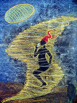 One can even capture him by throwing into the dust devil the beads of a rosary seed[31] (or rosary made of grass or sedge[e]), or by pouncing on it using a sieve with a cross-shape on it.[20][32] (see Voltolino's painting on right[f]).