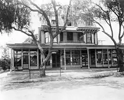 Sackett Hotel, the first hotel in the area that would later be known as Hollywood, was built by Horace David Sackett and Ellen Sackett in 1888,[1] on land bought from Harvey Henderson Wilcox for $2000 ($69,993 in 2024). Located on the corner of Prospect Avenue (Hollywood Boulevard today) and Cahuenga Boulevard, the hotel was three stories tall, featured a mansard roof, and was made of wood.[2]