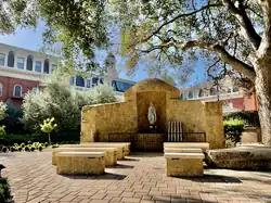 Main Building (1898) – Repaired and restored after the 1906 and 1989 earthquakes, the Main Building houses school-wide administrative offices, classrooms, meeting and reception rooms, a chapel, and two libraries. At the time of its construction, the design was described as "in the Italian Romanesque style, the foundations of concrete, the superstructure of red stock brick, with stone and terra-cotta trimmings and a slate roof."[9] After its 1913 reconstruction, it affected "a monumental French Second Empire design."[86] Combined with the adjoining, 350-seat Performing Arts Center, it forms an open courtyard that partially encloses a labyrinth and grotto.