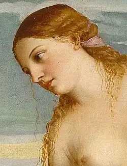 Between the two women is a small winged boy, who may be Cupid, son and companion of Venus, or merely a putto. He is looking intently into the water, and splashing a hand in it. The woman on the left is fully and richly dressed; her clothes are now usually recognized as those of a bride,[11][12] though in the past they have been said to be typical of courtesan wear. In her hair she wears myrtle, both a flower sacred to Venus and one worn by brides.[11][13]