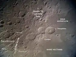 Sacrobosco is an irregular lunar impact crater that is located in the rugged southern highlands to the west of the Rupes Altai escarpment. It is a readily identified feature due to the three circular craters that lie on its floor. The rim of Sacrobosco is heavily worn and eroded, especially in the northeast. The floor is relatively flat in the south, except where overlain by Sacrobosco A and B, but is somewhat irregular in the northeast.