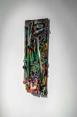 Sadaharu Horio was born in 1939 in Kobe, Japan. His father worked as a cameraman for the military and later for a newspaper. Although he showed interest and talent in painting in his youth, in 1955 Horio began training in the Kobe shipyard of Mitsubishi Heavy Industries. He worked for the company until his retirement in 1998. In 1956, Horio first caught the attention of the Gutai group’s leader Jirō Yoshihara. In 1965, he participated in the 15th Gutai Art Exhibition at the Gutai Pinacotheca in Osaka, but shortly after, had a crisis and destroyed all his works with the intention of quitting painting.[1] Horio continued, encouraged by Kazuo Shiraga and Saburo Murakami, and became an official member of Gutai in 1966, holding a solo show at Gutai Pinacotheca in 1968. In 1969, he became a member of the Ashiya City Art Association. He participated in Gutai projects until its dissolution in 1972.