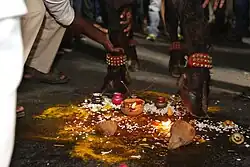 Once puja is completed, the first male buffalo in the procession is brought over and made to stomp over the lit diya. This is the official commencement of the Sadar festival.[8]